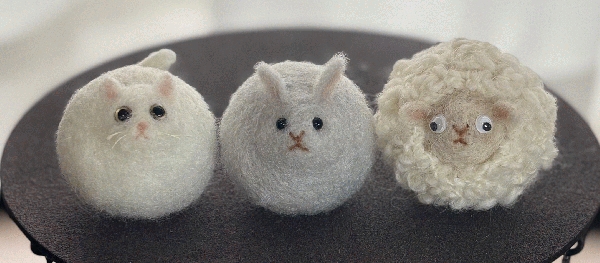 特殊な針(ニードル)を使って、アクリル素材の繊維を刺しながら、固めてフェルト化し、作品を作る手芸です。3回連続の講座で、1回目:「ヒツジ」、2回目「ウサギ」、3回目「ネコ」をモチーフにした、ころりんとしたアニマルシリーズを3作品作ります。(サイズ:各高さ5p×横幅4p)