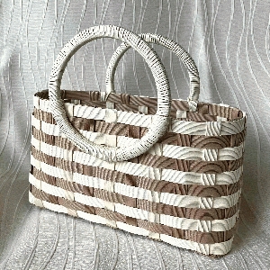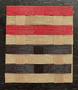 クラフトバンドは、初心者でも扱いやすい、紙素材の手芸材料です。3回連続講座で、軽くて丈夫なクラフトバンドを編んで、可愛い「ボーダー柄の手提げかご」を作ります。(横幅約29×厚み11×高さ16cm) 作品は2色使いのボーダー柄です。ご希望の配色を3パターンから選んでください。バンド色見本は下記参照ください。(@オフホワイト×ベージュ、A赤×ベージュ、Bこげ茶×ベージュ) 開催日:令和8年1月9日、2月13日、3月13日(全3回、すべて金曜日) 時間:午後1時半〜3時半