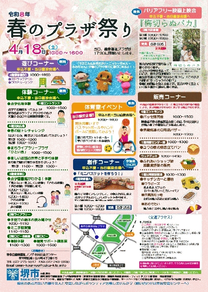 春のプラザ祭り 4月18日(土)10:00〜16:00 当日、健康福祉プラザは17:30に閉館します。 チラシのダウンロードは こちら(※イベント詳細はチラシをご参照ください) ●サカエル&みそさかい・ニッシーちゃん・みみちゃんが春のプラザ祭りに遊びに来るよ ●バリアフリー映画「梅切らぬバカ」